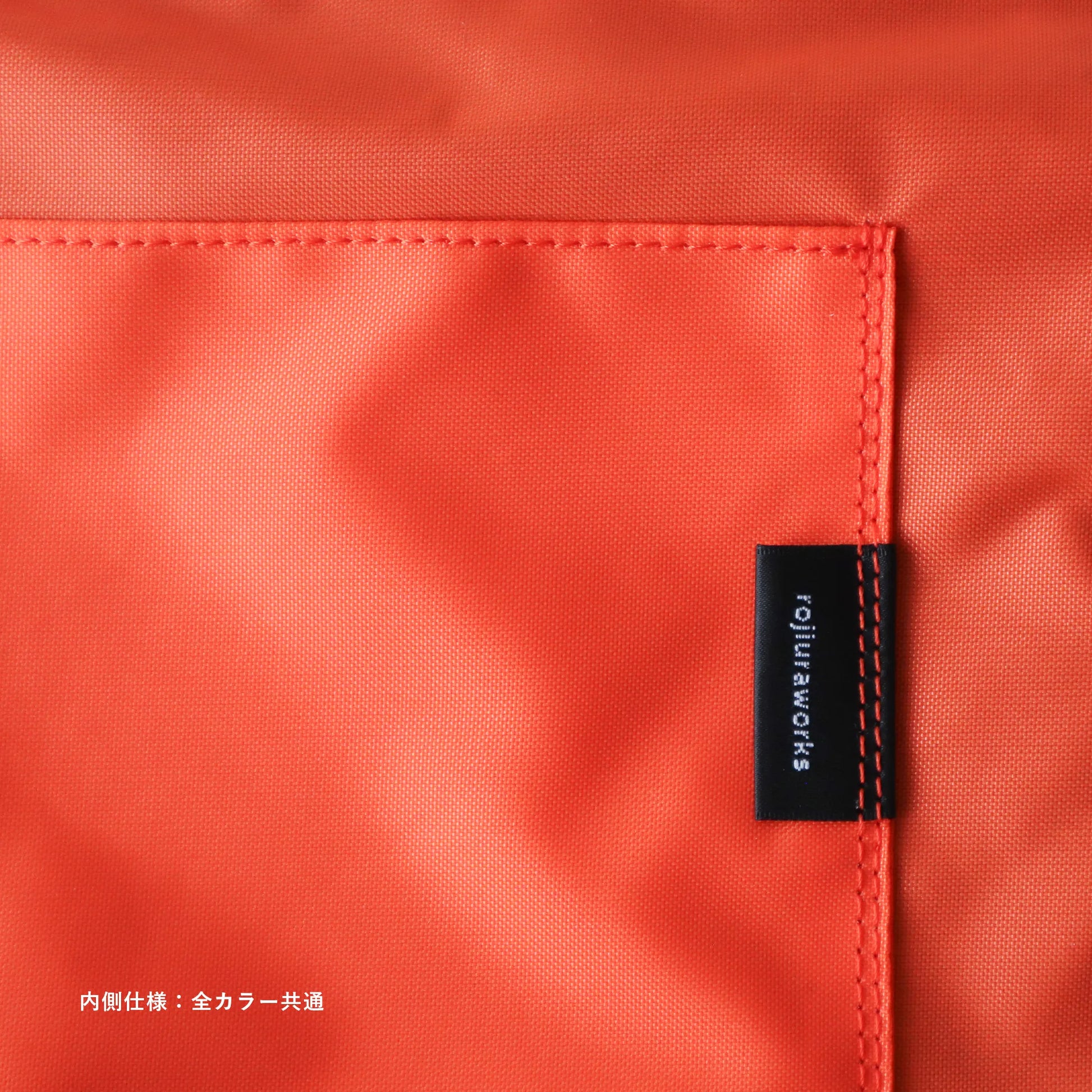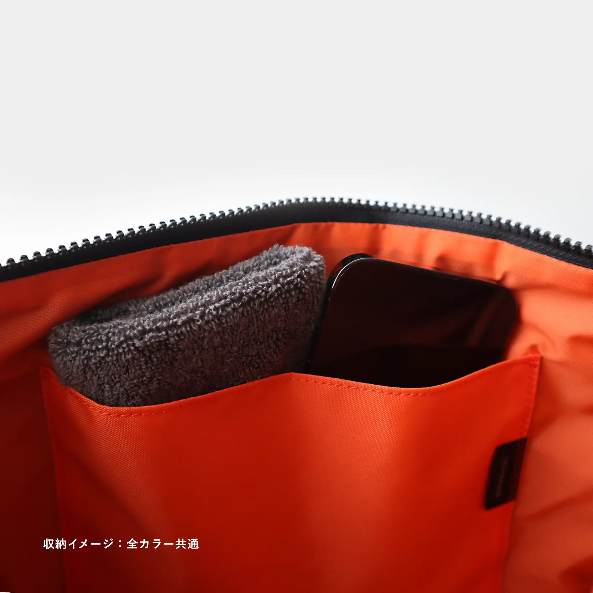 長財布・500mlペットボトル・文庫本・スマートフォン・鍵が収まり、内部は視認性の高いオレンジで中身を探しやすい仕様です。