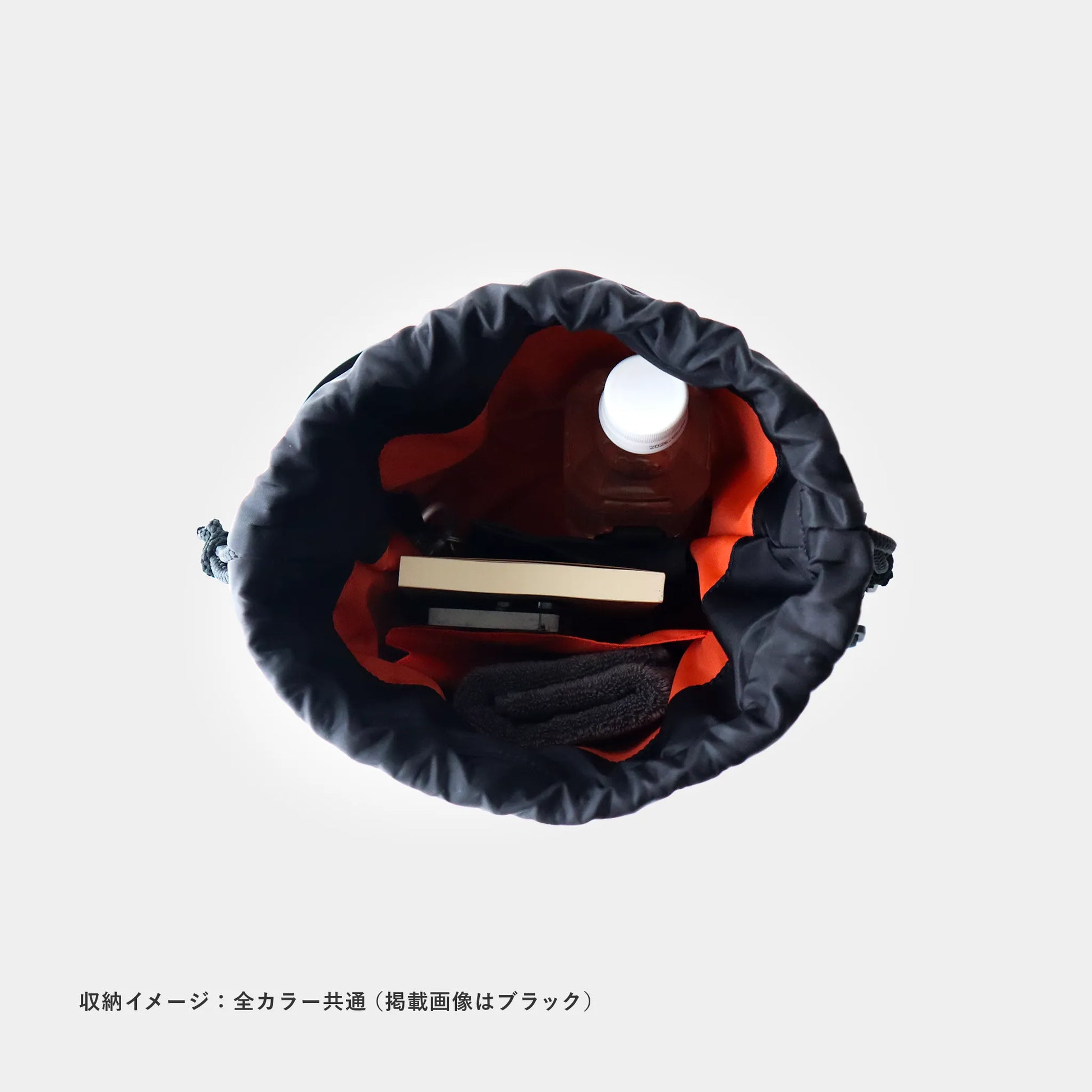 紐を緩めて開き、引いて閉じるシンプルな巾着口です。